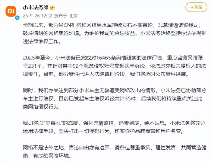2025年至今,小米法务已完成对16465条舆情线索的法律评估,重点监测网络账号231个,并针对其中92个恶意侵权账号提起民事诉讼,依法追究相关侵权人的法律责任。目前,部分案件已进入法院审理阶段,我们将适时公布案件进展。
