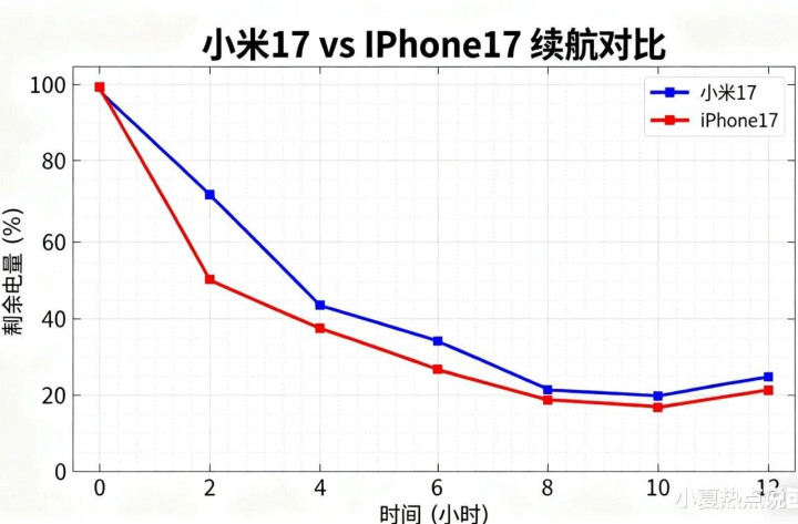 连续使用「12.2小时」后,小米17仍剩**26%**电量,iPhone17已关机。